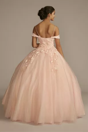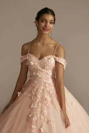 This sparkling tulle quinceanera ball gown is covered in dimensional floral appliques and features detachable crystal straps and swag sleeves that let you change up your look throughout the night.