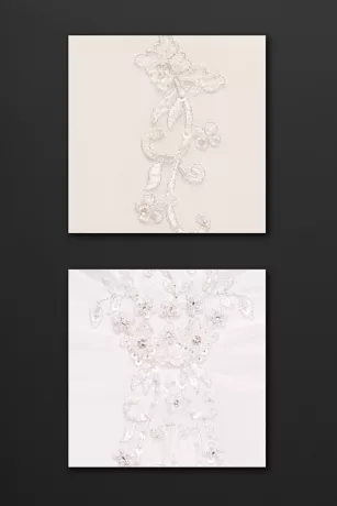 Designed with elegance in mind, this satin A-line wedding dress offers a versatile church-to-reception look, with its beaded cap sleeves. The satin skirt is topped with a metallic-embroidered chiffon overlay.