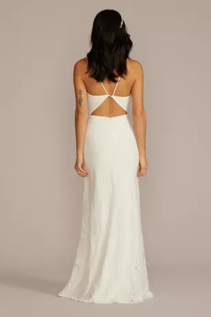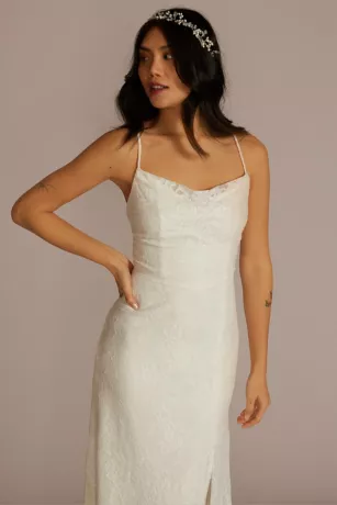If you’re looking for a fresh and modern bridal look, this sheath gown is up to the task. Details like the fun cowl neckline and captivating open back elevate the simple silhouette, while the front slit lets you move, walk, and dance the night away.