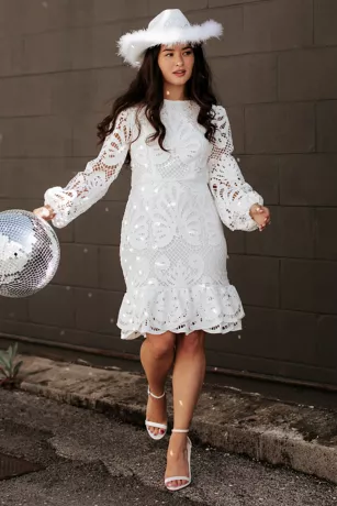 Add a flirty flair to your bridal shower, rehearsal dinner, or farewell brunch look with a short skirt, flounce hem, and chic allover lace. The high neck and long sleeves work in tandem to play up your personality–and a great pair of earrings!