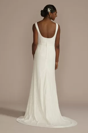 Prepare to wow as you walk down the aisle in this high-neck tank wedding dress. Adorned in allover tonal sequins, you’ll sparkle with each and every step. A low scoop back adds a final flourish, ensuring that your exit will be just as dramatic as your entrance.