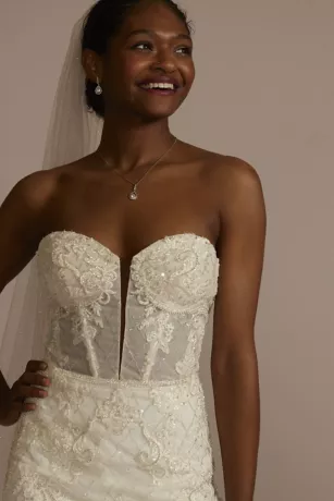 The picture of sultry romance, this alluring wedding dress uses its fabric, embroidery, and embellishment to create a vision of sexy sophistication. Opulent brocade appliques sit atop delicate, diamond patterned tulle, which covers the dress from the strapless illusion-plunge neckline to the trumpet skirt. An overlay of sequined, embroidered fabric and layers of tulle, glitter, and shimmering metallic filigree lace cascades into a dramatic cathedral train. Visible boning at the sheer bodice gives a corset-like appearance that ties together the old-meets-new romantic look.