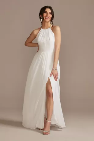 An easy-to-wear wedding dress with pretty details, like a goddess-draped bodice and tie back.