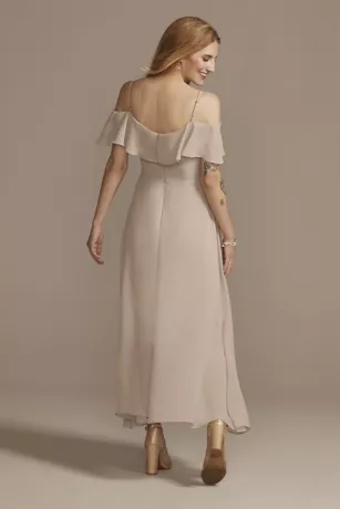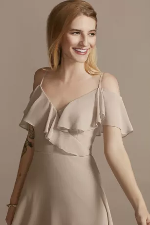 This cute chiffon bridesmaid gives off a romantic vibe with its off-the-shoulder ruffle neckline and slight high-low hem.