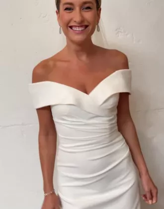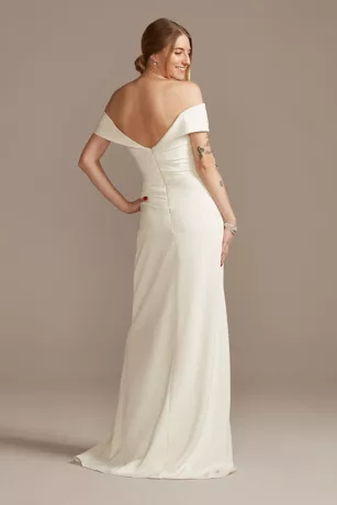 Simply elegant, this crepe off-the-shoulder wedding dress is beautifully draped for a flattering fit.