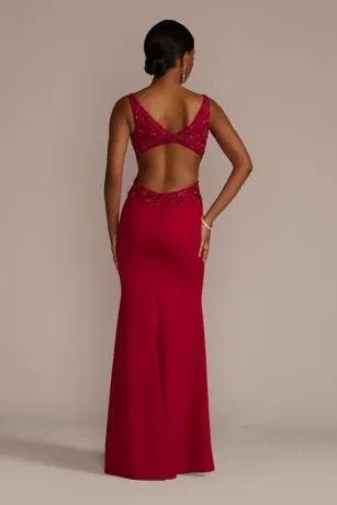 Simply seductive, this crepe sheath gown is all about the glam, thanks to illusion embellished lace detailing at the waist, intricate beaded trim on a gorgeous open back, and a sexy thigh-high slit.