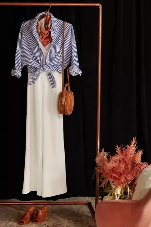 This chic crepe jumpsuit is defined by crisp lines, from the dramatic off-the-shoulder cuffed neckline to the clean seams down the bodice to the wide leg, pocketed pants. Rock a sleek ponytail and a statement earring to complete the look.