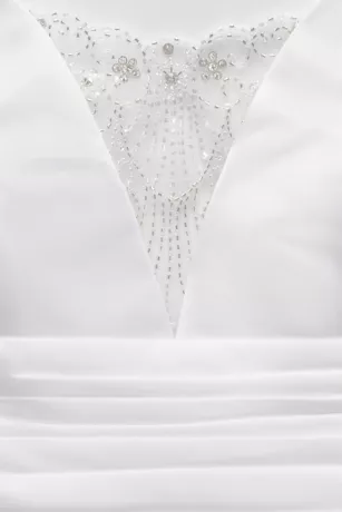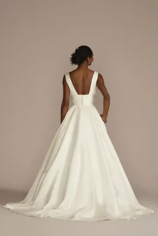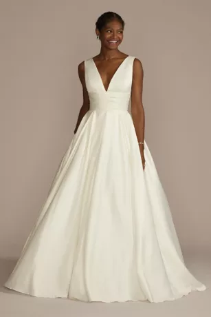 A traditional wedding dress with just a hint of drama, this structured satin ball gown features a plunging V-neckline, a low back with wide-set straps, and a figure-flattering pleated cummerbund waistband. Side pockets and a snap-in beaded mesh coverage panel complete the dreamy silhouette.
