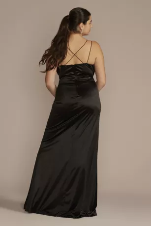 Double the straps, double the fun! This floor length dress features double spaghetti straps, a modern square neckline, and a sexy thigh-high slit. Ruching adds texture to the figure-hugging stretch satin fabric.