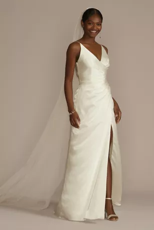 Both classically sexy and undeniably elegant, this satin wedding dress is full of beautiful details like a draped surplice neckline, fabric-covered buttons at the asymmetrical waist, and dainty adjustable spaghetti straps.