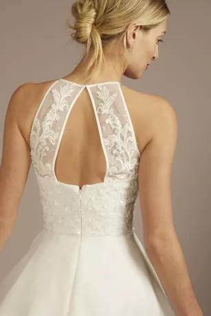 An embellished, sparkle illusion fabric halter neck bodice is a fresh take on bridal style. Paired with a sparkle detail waistband atop a full A-line skirt and interesting keyhole back detail, you’ll steal the show when you say “I do.”