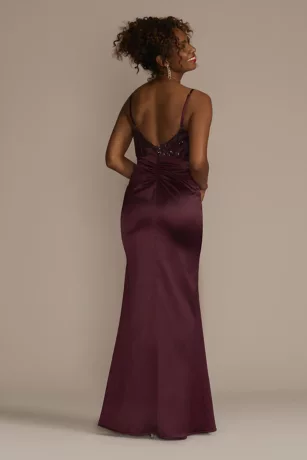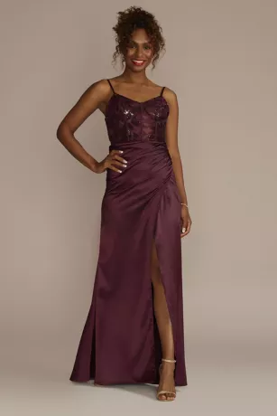 You’ll be absolutely captivating in this glamorous sheath dress at your next special event. Whether guests will be eyeing the sequin embellished illusion corset or the double slit draped skirt, there are no shortage of sexy details.