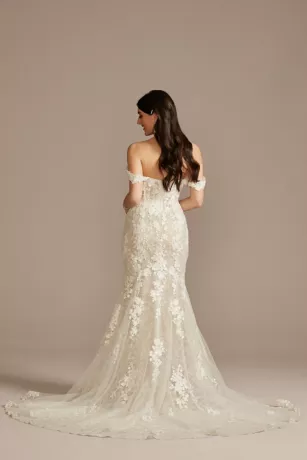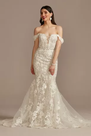Featuring two different types of sequin lace appliques, this mermaid wedding dress is a beautiful sight to behold. A plunging neckline, a boned corset bodice, and swag sleeves lend charming details, while a power mesh bodysuit lining ensures a smooth fit. Complete with an elegant chapel train.