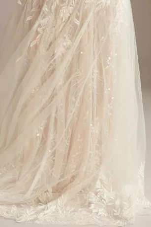 Embellished with embroidered appliques and sequins, this lace wedding dress exudes sultry sophistication. The strapless, lingerie-inspired corset bodice has bustier-style cups and grosgrain-covered boning detail for added structure. The curve-hugging silhouette flares into a trumpet skirt, with layers of textured florals and vines cascading into a chapel train, and is finished with leaf-embellished trim along the hem.