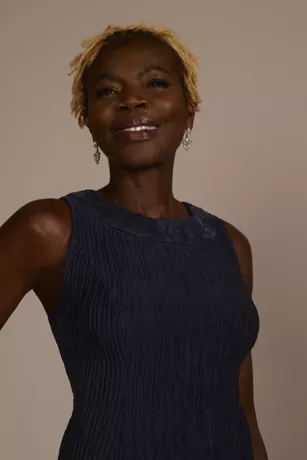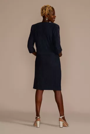 Sparkling sequins detail the illusion sleeves of a cropped knit jacket, perfectly matching the sheath dress’ scoop neckline. An elegant choice for any mother of the bride or groom.