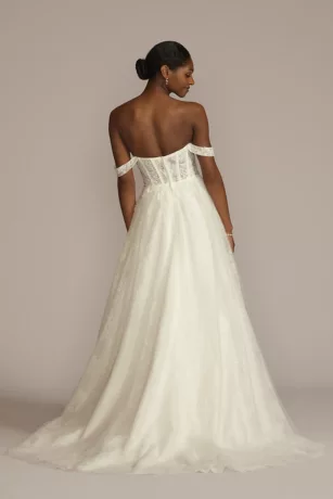 This corset bodice is adorned with meticulously hand-placed lace appliques for the perfectly romantic wedding gown. Personalize your wedding day look with the detachable swag sleeves.