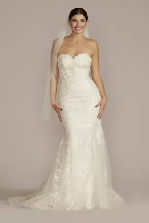 When your bridal style is classic and traditional, look no further than the timeless mermaid silhouette. The romantic detailing of the floral appliques and sweetheart neckline elevate your look, while the detachable spaghetti strap sleeves allow you to customize as you please.