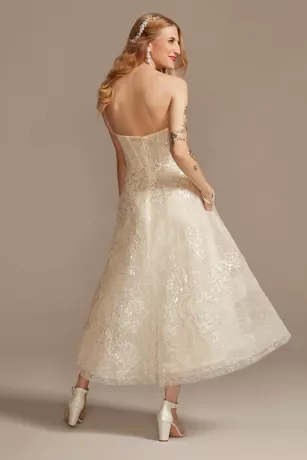 Brimming with both shine and style, this strapless dress is crafted of glittery floral tulle and topped with lace appliques and over 2,000 hand-sewn beads and sequins. The interior boning at the bodice adds lovely shape, while the stunning tea-length skirt creates a sensational focal point. (Plus, it has pockets!)