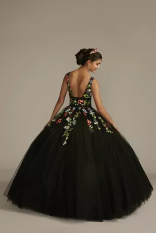 This quinceanera dress bursts with elegance! Turn heads with the perfect blend of traditional and contemporary, from the multicolor floral appliques to the illusion neckline to the full tulle skirt.