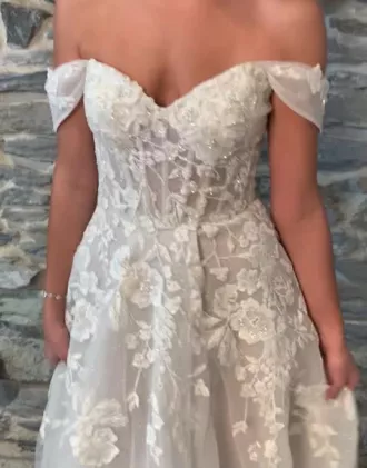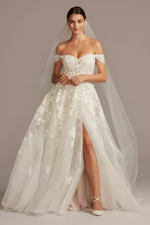 An A-line wedding dress gets romantic updates to create a beautifully unique, poetic wedding dress. With visible boning details that add silhouette-defining structure to the sheer sweetheart bodice and removable swag sleeves for an off-the-shoulder look, the gown is finished with embroidered floral appliques that cascade down the airy, tulle skirt. Glittery layers add sparkling dimension, and the look is finished with a hidden skirt slit.