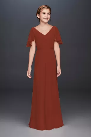 Flowy flutter sleeves and a crisscross back provide pretty detail to this classic, crinkle chiffon junior bridesmaid gown.