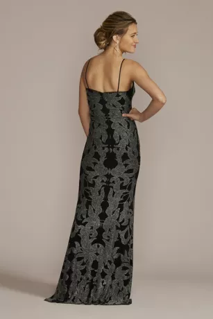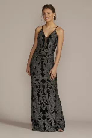 An elegant choice for prom or any occasion, this long sheath gown is covered in a glitter brocade pattern and features an illusion inset at the neckline.