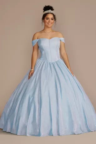 Is it really a quinceanera without glitter and a full ball gown skirt? We don’t think so! Celebrate your big day your way with convertible swag sleeves that can be worn off the shoulder, as a tank, or removed entirely! A corset bodice paired with the voluminous skirt makes you feel like a reina del cumpleanos.