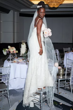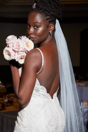 Your confidence will soar when you slip on this sexy, sheer-bodice wedding dress. Crafted of 22 yards of fabric, this modern mermaid style is adorned with exquisite paillette scroll beading. The plunging back detail and draping chapel train will make your recessional unforgettable.
