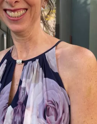 This floral print floor-length gown is ready to party, with front and back keyholes and a skirt slit. Rhinestone detailing accent the high-neck and waistline.