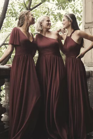 With a figure-flattering crisscross waistband and a full skirt with an extra-wide sweep (meaning: totally dance-worthy), this mesh high-neck halter bridesmaid dress is a party-pleasing pick.