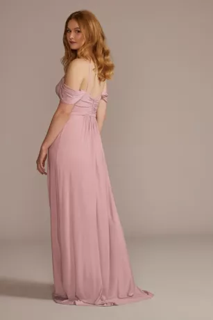 Soft jersey fabric flows beautifully from the twist knot empire waist bodice of this off-the-shoulder bridesmaid dress: so flattering!