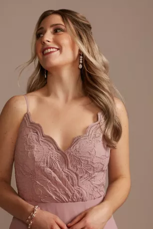 A romantic bridesmaid dress with a stretch lace bodice and beautifully full floor-length chiffon skirt with slit. Adjustable spaghetti straps and handy pockets.