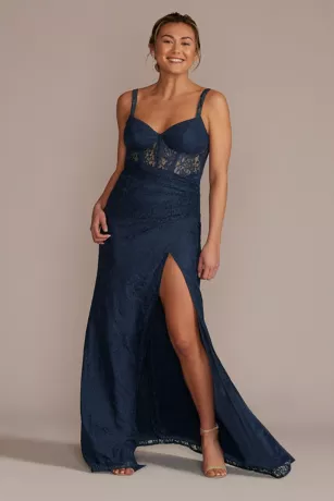Lace looks totally luxe on this corset bridesmaid dress with a sheer bodice, side drape, and high slit. Features bra cups.