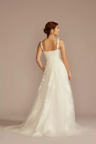 Every layer of this tulle A-line skirt is adorned with stunning lace appliques that trail the length of the chapel train below. The decorated sweetheart bodice is complete with a lace-up back and removable straps.