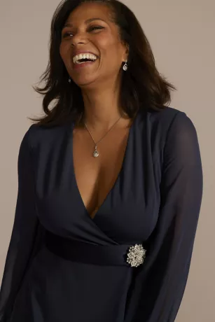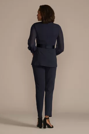 This sleek crepe pantsuit adds feminine flair with sheer long sleeves, a stunning V-neckline, and embellished satin belt. Wear to an upcoming special occasion or your next night out for a memorable look.