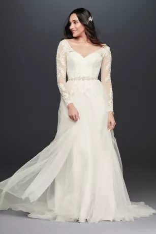 Illusion mesh sleeves strike a lovely balance between covered and bare, particularly when paired with a flattering, wide-set V-neck and low back. The A-line tulle skirt adds a softly voluminous finish.