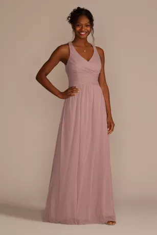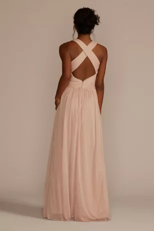 This long mesh bridesmaid dress is a flattering option thanks to the fitted bodice, V-neckline, and crisscross back straps.