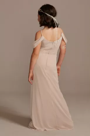 Draping at the sleeves, a spaghetti-strap V-neck bodice, and a statement ruffle give this chiffon junior bridesmaid dress a modern boho feel.Â