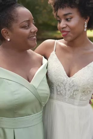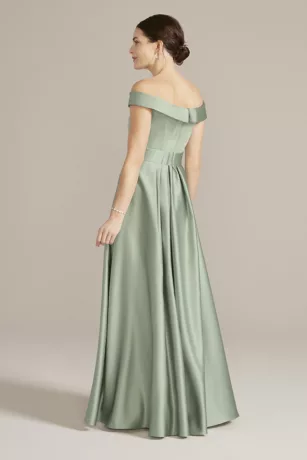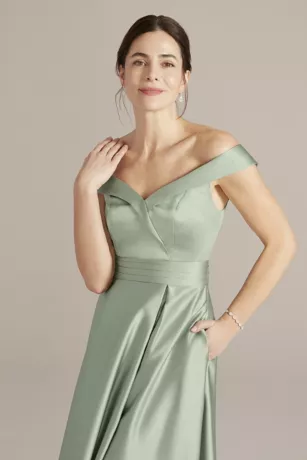 Sleek, shiny satin moves with you in this elegant, off-the-shoulder gown. A refined sweetheart neckline, full skirt, and waist detail makes it the perfect celebration ensemble.