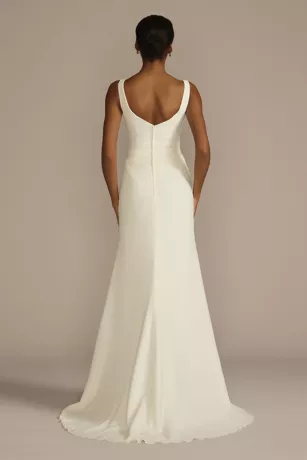 Beautifully crafted pleating and draping give this chiffon A-line wedding dress chic texture and shape, while a surplice neckline and a V-back add figure flattering details. A sweep train completes the goddess-like look.