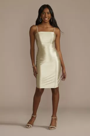 Designed to be seen, this youthful short sheath dress features striking stretch satin fabric and a trendy straight neckline. A lace-up back is the perfect finishing touch for this party look.