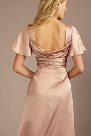 Made of silky, satiny stretch charmeuse fabric, this A-line bridesmaid dress is full of gorgeous details: flutter sleeves, a cowl back, handy pockets, and a skirt slit.
