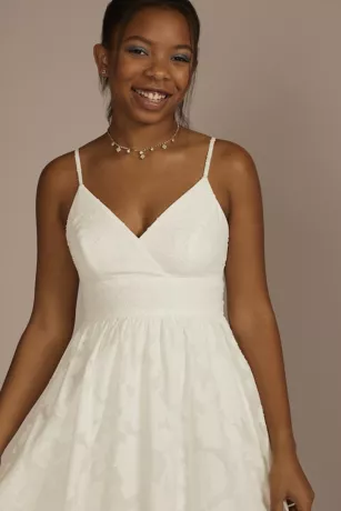 Floral jacquard makes a statement on this short A-line dress perfect for graduation or your upcoming party. The V-neckline is balanced by a youthful skirt for a look that’s equally flirty and fun.