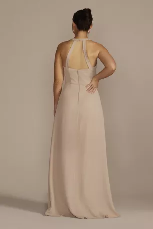 A on-trend cowl neckline adds to the appeal of this bridesmaid dress with side-draping and a skirt slit. Made of crinkle chiffon for touchable texture and dimension.