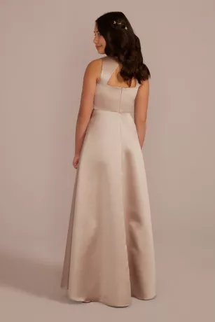 An elegant satin junior bridesmaid dress, this A-line style features a sleeveless bodice, keyhole back, and pockets!