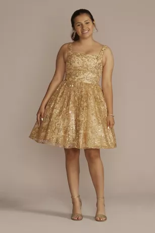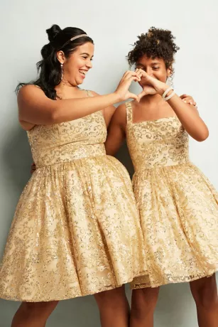 Dance the night away in this playful A-line damas dress, designed with countless swirls of glistening sequins. A square neckline adds a modern touch to the regal look.