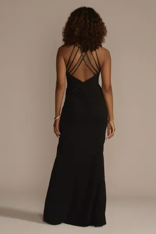 There’s nothing basic about this classic sheath. A modern sweetheart neckline and skirt slit make for a memorable entrance, while sexy backside ruching and a dramatic strappy back ensure an unforgettable exit.