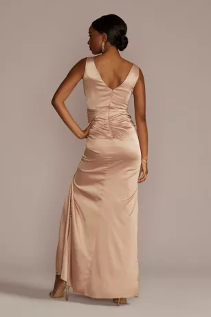 The silky, satin-like fabric makes this ruched stretch charmeuse bridesmaid dress a sexy choice. Adjust how high the skirt slit goes by pulling the drawstring!