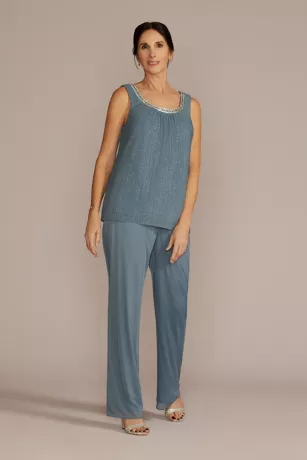 Three-piece ensembles are a comfortably chic choice for any mother of the bride or groom. This head-to-toe look features a rhinestone trimmed metallic tank top, matte chifon pants, and a flowy three-quarter sleeve jacket.