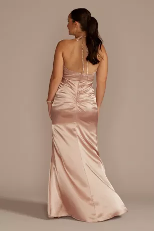 A stunning bridesmaid dress with sexy details, this satiny charmeuse style ties at the neckline, with an open back and a high slit on the side-draped skirt. Booty ruching helps flaunt your assets. Features bra cups.